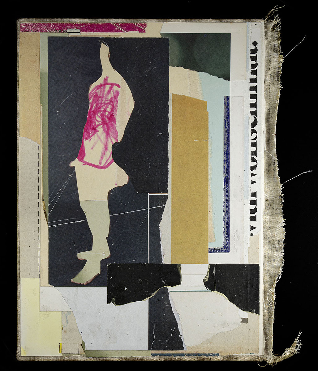 Collage with found images and printed offset paper and hard bookcover.